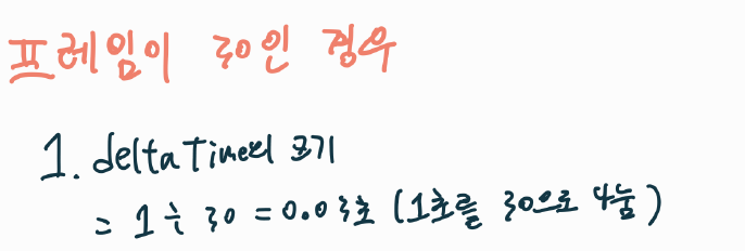 delta는 값의 차이를 뜻하는데, 현재 프레임의 시작시간과 이전 프레임의 시작시간과의 차이이다. 이는 지난 프레임이 완료되는 데까지 걸린 시간 차이를 의미하는 것과 동일한 의미이다. 즉, 한 프레임을 진행하는데 걸린 시간을 뜻한다.
