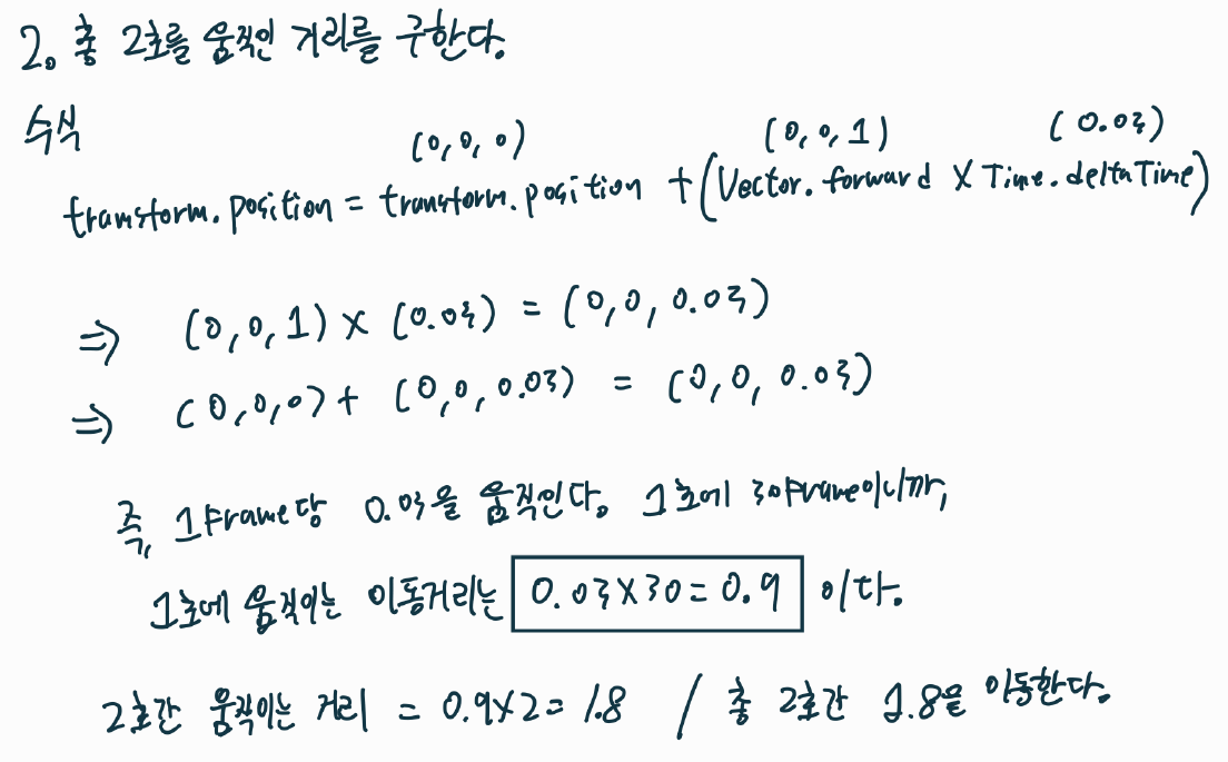 단위벡터(길이가 1인 벡터)에 Time.deltaTime을 곱했을 때는 0.033초당 0.033씩 이동할 것이다. 이는 $ 거리 = 속력 \times 시간 $ 으로 계산 가능한데, 거리는 단위벡터인 Vector.forward로 생각하고 시간은 Time.deltaTime을 이용한다. 어차피 여기선 단위벡터이므로 0.033초가 지났을 때는 거리가 0.033으로 똑같이 이동했을 것이다. 유니티 좌표계에서 1은 현실에서 1m정도를 뜻하는 것으로 알고 있는데, 그렇다면 0.033초마다 0.033m씩 이동한다고 보면된다.