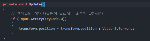 다음과 같이 코드를 짜면 문제가 된다. 프레임이 10 이라면 캐릭터는 1초에 캐릭터를 10번 움직이게 되고, 프레임이 60일 때는 1초에 캐릭터를 60번 움직이게 된다. 즉, 컴퓨터의 성능이 오브젝트 이동 속도에 영향을 미치게 되므로 각자 유저의 컴퓨터마다 게임의 성능이 달라지게 된다.