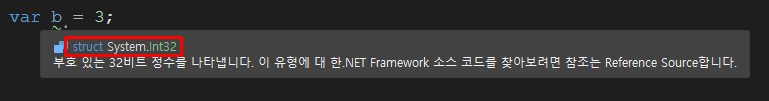 var키워드에 마우스를 올려보면 자동으로 System.Int32으로 인식하는 것을 확인할 수 있습니다. 즉, int타입으로 인식합니다. (System.Int32가 왜 int타입인지는 .NetFramework의 데이터타입과 구조를 알면 알 수 있습니다.)
