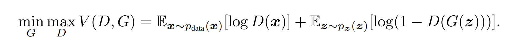 판별기는 최종적으로 입력이 진짜인지 가짜인지를 나타내는 확률을 출력한다. 학습의 목표는 다음과 같다.