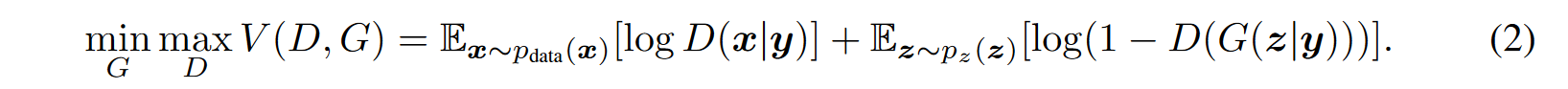 - 생성기와 판별기에 특정 condition을 나타내는 정보 y를 추가해주며, 이 y는 형태가 정해진 것은 아니라 다양한 형태를 가질 수 있다.