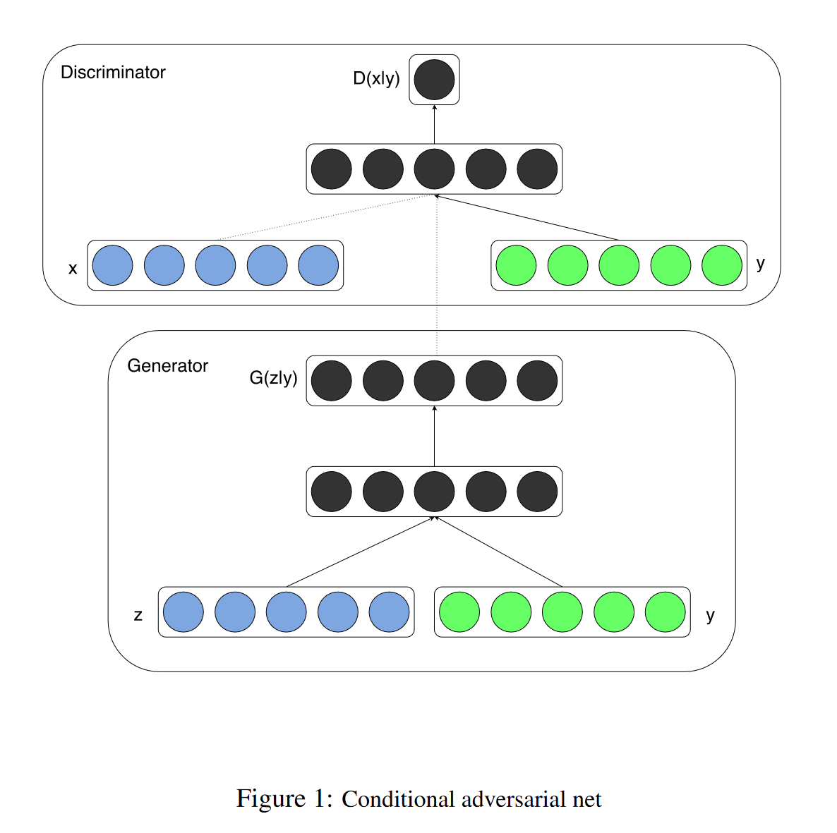 판별기에서 $x$와 $y$는 입력으로 존재하며 판별 함수(이 경우 MLP로 다시 구현됨)로 표시된다.