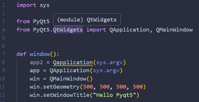 Qapplication으로 잘못 타이핑 한것은 "Qapplication is not defined"로 lint error를 잘 띄워주며, 라이브러리가 있는 다른 것들은 빨간색 에러라인을 띄우지 않게 되었다.