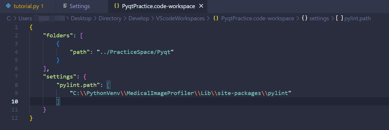 그리고 pylint의 절대 경로를 입력할 때 어느 settings.json에 값이 입력될지를 잘 선택하는 것이 중요하다. 나는 해당 설정이 user 정보에 저장되어 모든 환경에서 적용되는 것이 아닌, 로컬의 workspace 단위에서만 적용되는 것을 원했다. 그래서 작업하는 공간을 vscode workspace로 따로 파일을 만든 공간의 settings.json에 값을 추가하였다.