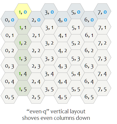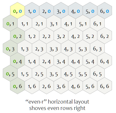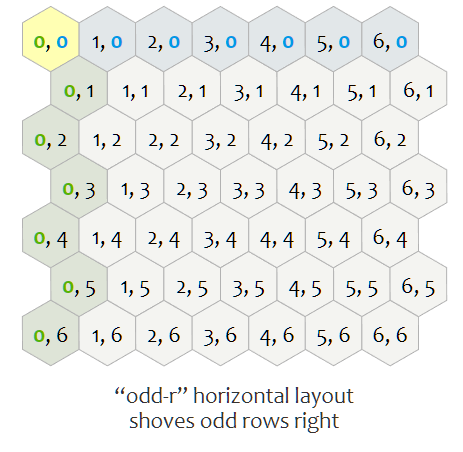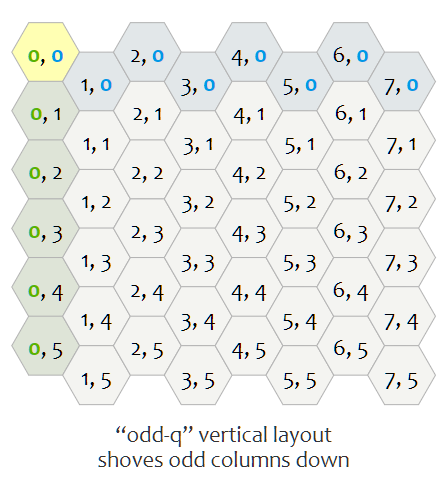 가장 일반적으로 사용되는 방식은 서로 다른 열과 행을 offset 하는 것이다. 열은 $q$, 행은 $r$으로 표기한다. 홀수 또는 짝수 열/행의 오프셋을 지정할 수 있다. 그래서 수평 및 수직 육각형에는 각각 두 가지 변형이 있다.