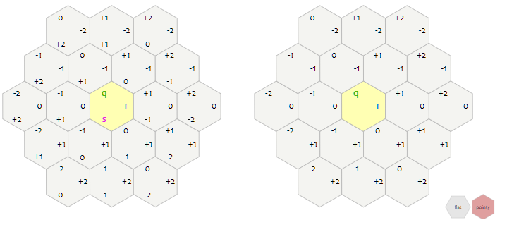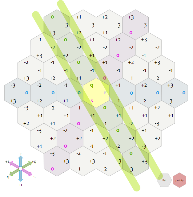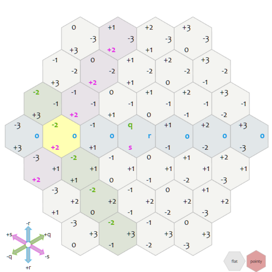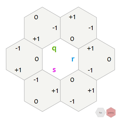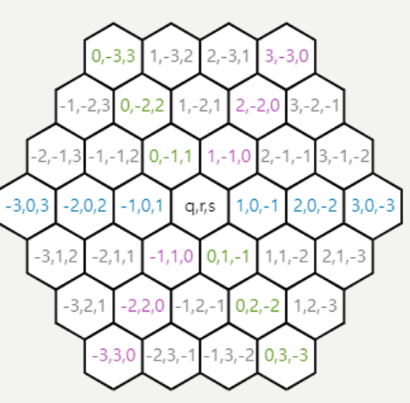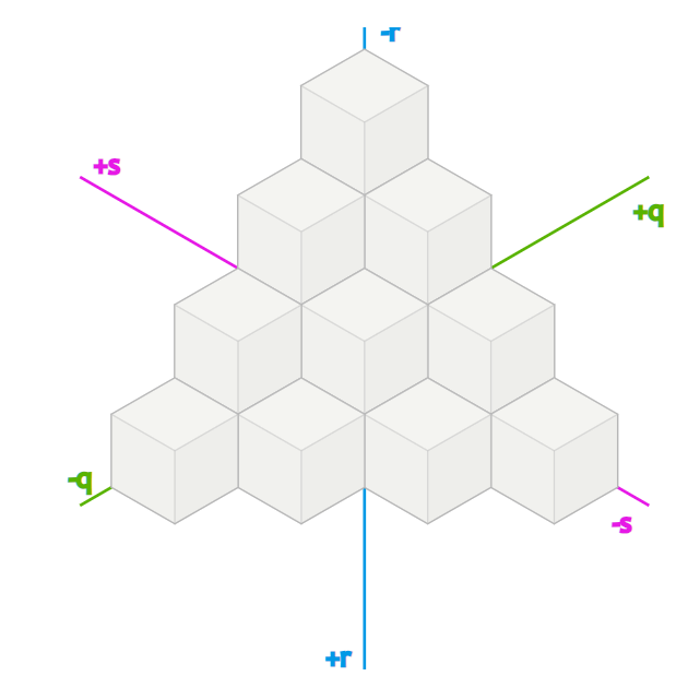 $q+r+s = 0$ 제약조건이 있는 것은, 좌표계를 단순화 하기 위해 큐브 좌표계에서 $x + y + z = 0$인 평면만을 잘라내었는데, 이 성질이 똑같이 유지되는 것이다. 이를 통해 3차원 공간에서 2차원 공간으로 투영할 수 있게 된 것이다.