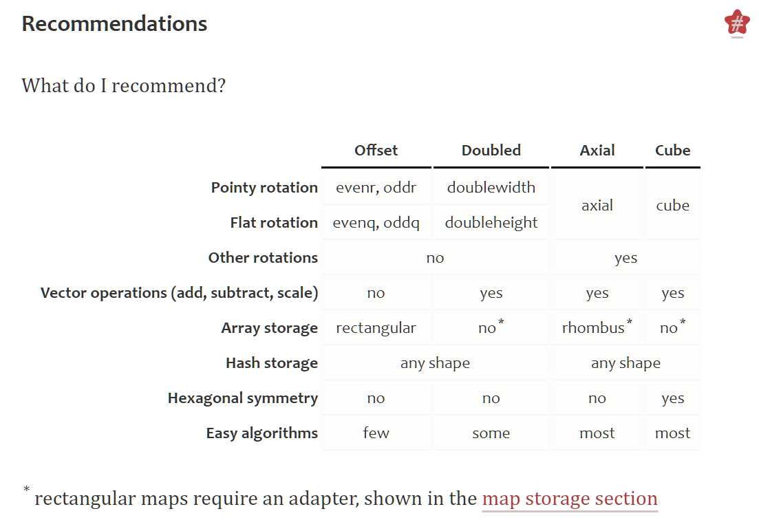 정사각형 Grid와 달리 육각형은 여러 방식이 존재한다. 글 작성자는 알고리즘에는 Cube coordinate를 선호하고, 저장에는 axial 또는 doubled coordinate를 선호한다고 한다.