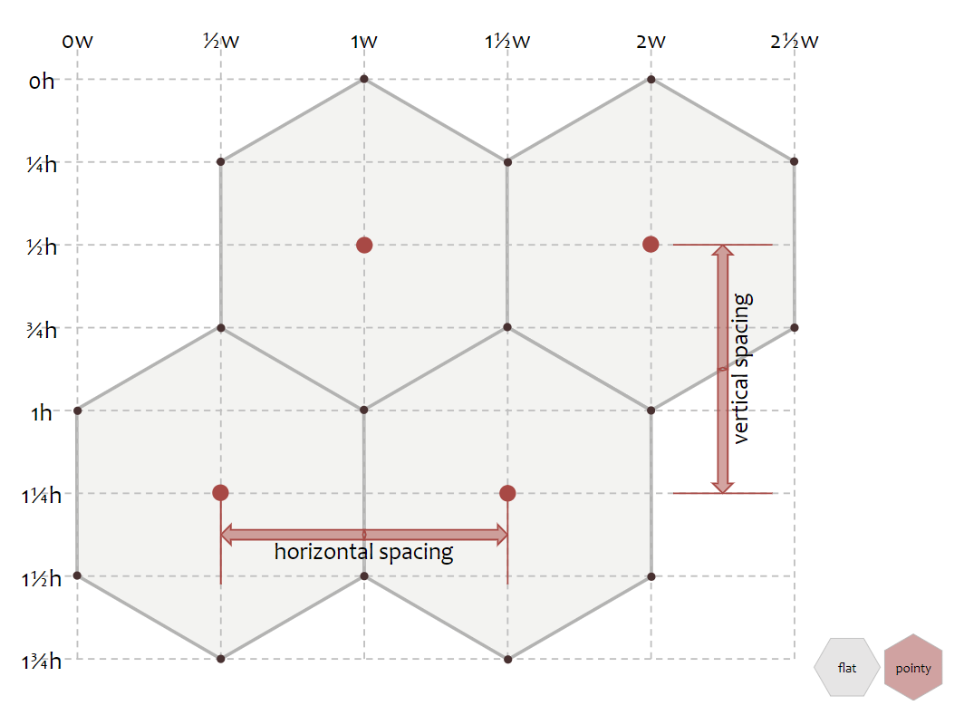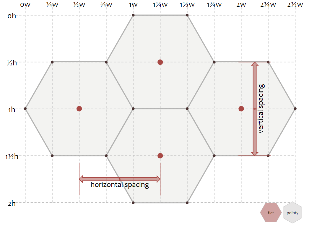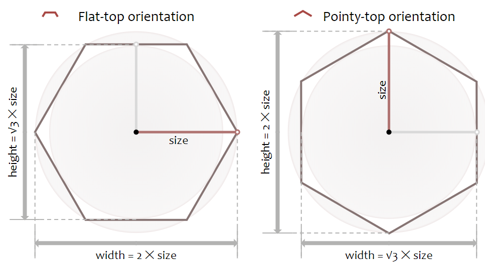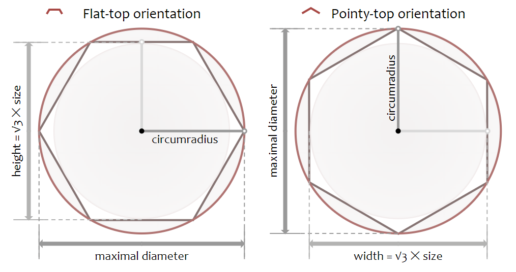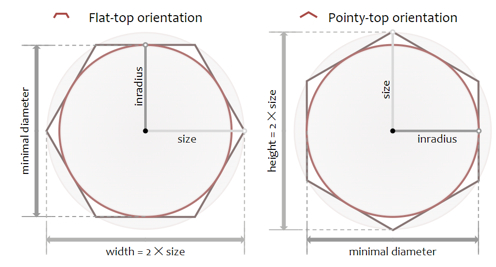 정육각형의 크기는 변(edge)에 닿는 안쪽원, 꼭짓점에 닿는 바깥족 원으로 설명할 수 있다. 해당 페이지에서는 바깥원의 반지름을 크기로 사용한다. 즉, 꼭짓점에서 시작하여 꼭짓점까지의 거리를 재는 방식(circumradius). Flat-top에서 좀 더 보기 쉬운 크기 측정 방식일 것이다. inner circle 방식은 inradius로, 변의 중심부터 변의 중심까지의 거리를 재는 방식이다.