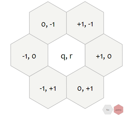 정육면체좌표계에서 하나의 공간을 이동할 때 3 cube coordinate에서 하나를 +1로 변경하고, 다른 하나를 -1로 변경해야 한다(합은 0으로 유지 되어야 한다). Axial은 s좌표를 저장하지 않는 점 말고는 Cube와 동일하다