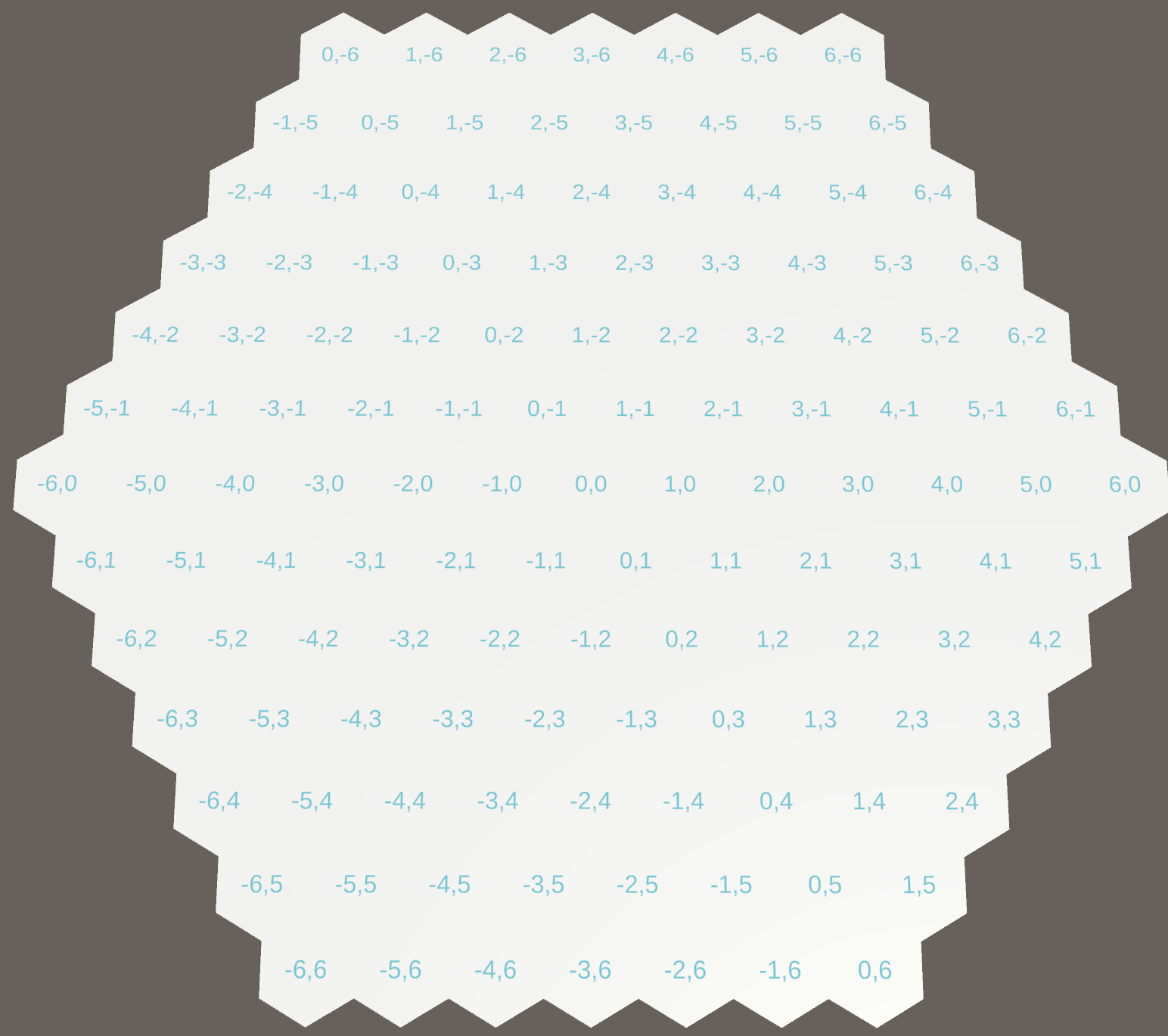 해당 루프는 정확히 필요한 좌표에 대해서만 반복한다. 다이어그램에서 각 범위는 한 쌍의 선으로 표시된다. 각 선은 부등신(반평면)이다. 6개의 부등식을 모두 만족하는 모든 육각형을 선택한다. 이 루프는 axial 좌표에서도 잘 동작한다.