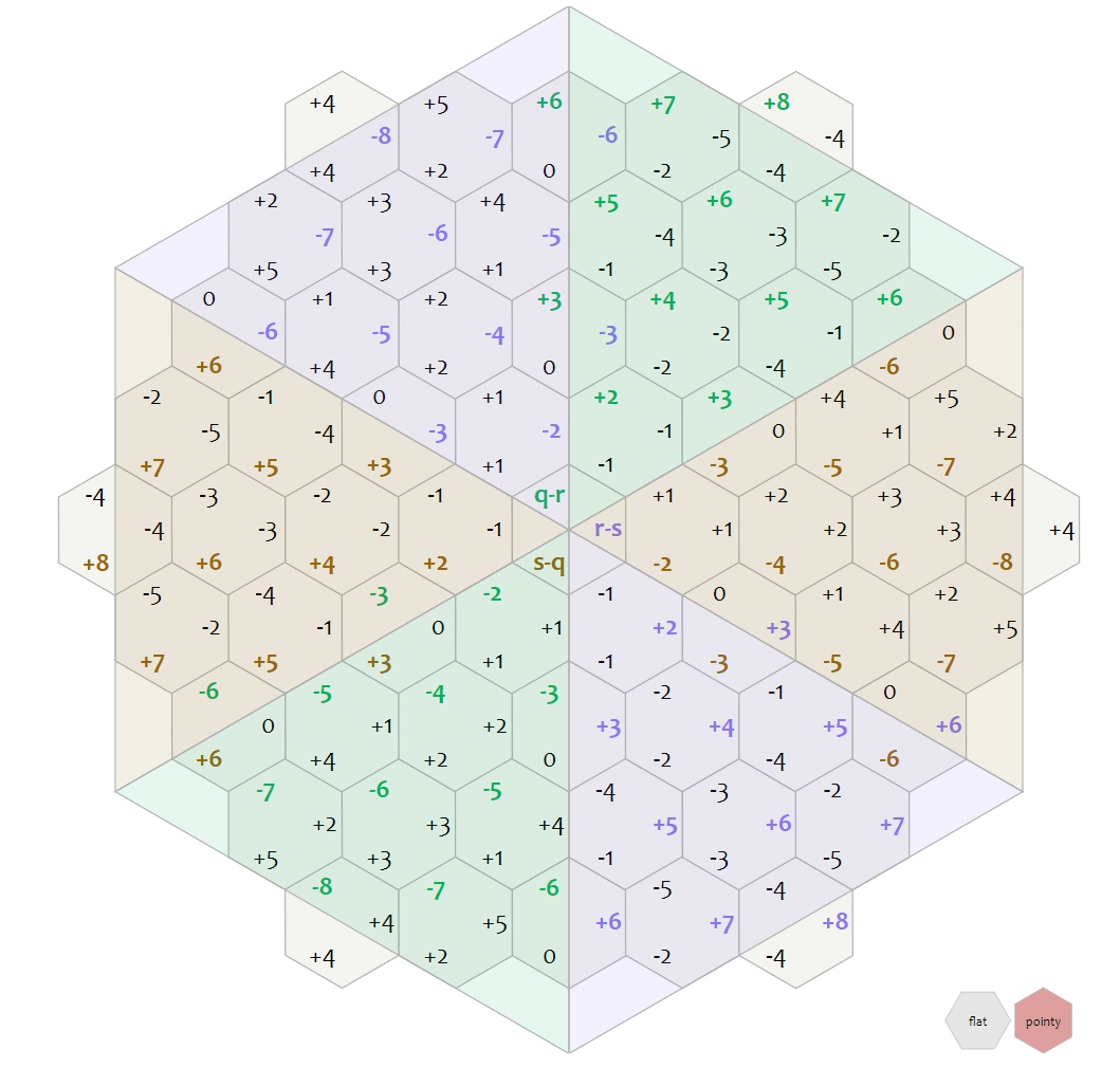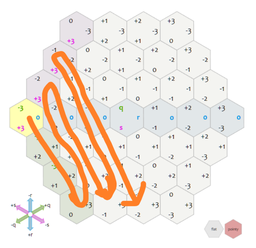 좌표의 움직임에 대한 하나의 팁이 있다면, 초록색으로 표시된 육각형은 q의 값이 고정인 상황이라고 하였다. 예를 들어 q의 값이 증가하는 방향이 헷갈린다면, 원점을 기준으로 q가 고정인 부분의 오른쪽영역은 증가하고 왼쪽인 부분은 감소한다.