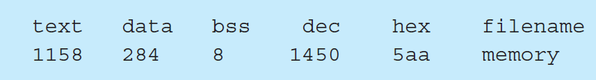 GNU의 Size 명령어는 일부 영역들의 크기(byte)를 확인할 수 있다. 위 C 프로그램의 실행 파일 이름이 "memory"라고 가정을 하고size 명령어를 입력하면 다음과 같은 출력이 생성된다: