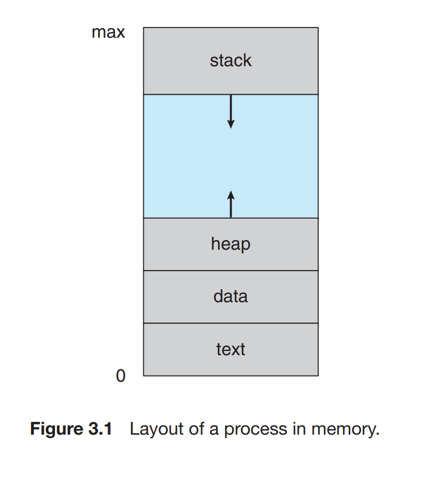앞서 언급했듯이 비공식적으로 프로세스는 실행 중인 프로그램이다. 프로세스의 현재 활동 상태는 프로그램 카운터(program counter)의 값과 프로세서 레지스터의 내용으로 표현된다. 프로세스의 메모리 레이아웃은 일반적으로 여러 섹션으로 나뉘며, 다음 그림에 제시된다: