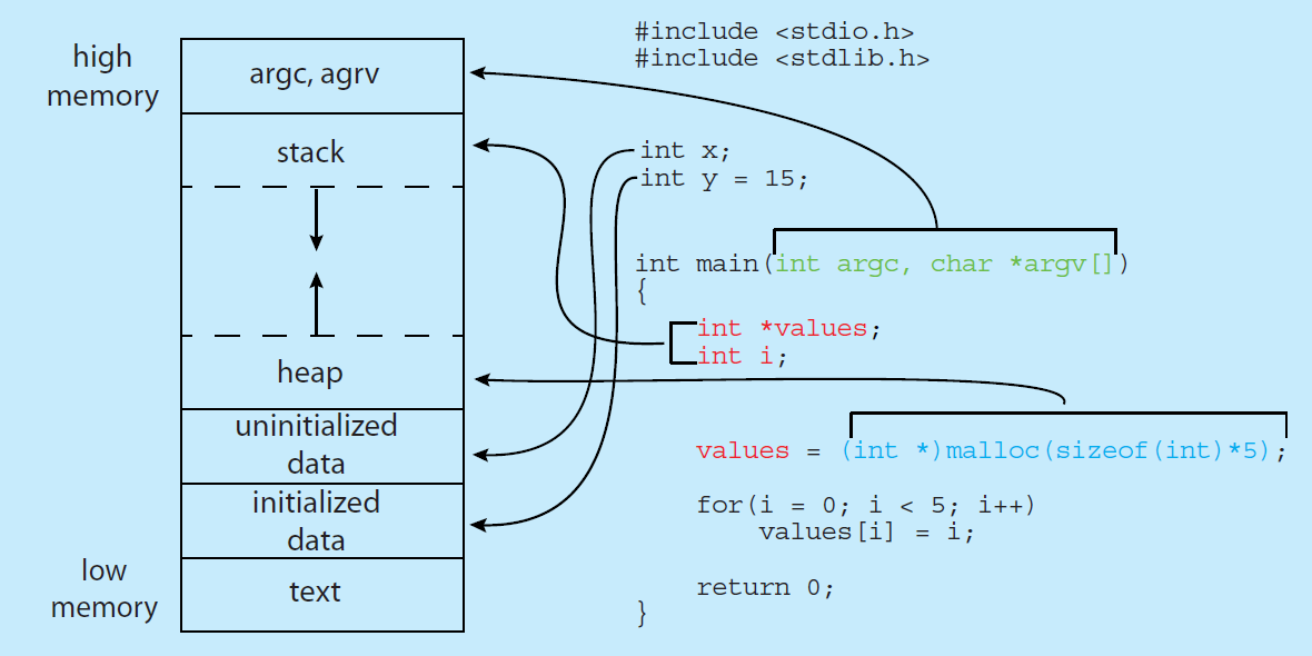 아래 그림은 메모리에 있는 C 프로그램의 레이아웃이다. 프로세스가 실제 C 프로그램과 어떻게 연관되는지를 확인할 수 있다. 이 그림은 메모리에 있는 프로세스의 일반적인 개념과 유사하지만 몇 가지 차이점이 존재한다:
