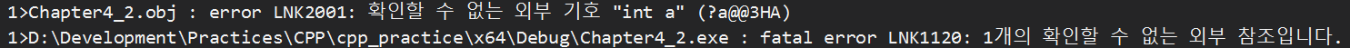 이 코드는 extern을 통해 변수의 몸체가 어딘가에 있다고 선언했지만, 별도의 몸체(메모리)가 없으므로 링킹에러(컴파일에러아님)가 발생한다.