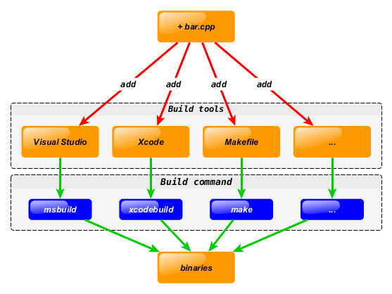 서로 다른 플랫폼/IDE에서 공유디는 C++ 프로젝트가 포함된 크로스 플랫폼 프로젝트가 있다고 가정해보자. Windows에서는 Visual studio, OSX에서는 Xcode, Linux에서는 Makefile을 사용한다고 하면 `bar.cpp`를 추가하기 위해 각각 다른 tool에 일일히 파일을 새로 추가해야 한다. 특히 빨간색 화살표는 수동으로 해야하는 작업을 의미한다. 일관된 환경을 유지하기 위해 비슷한 업데이트를 여러 번 반복해야하며, 이를 수동으로 수행해야 한다.