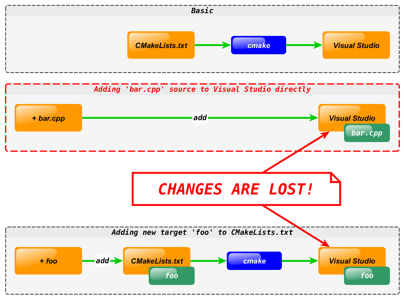 좋아하는 도구를 계속 써도 된다는 말과 모순처럼 들릴 수 있지만 그렇지는 않다. 어떤 IDE던 지속적으로 사용할 수 있지만, CMake가 총책임자임에 주의해야 한다. 자동 생성된 파일을 수정하는 일은 없도록 하자. CMake를 사용할 때는 IDE안에서 빌드 설정을 절대 직접 수정하면 안된다. CMakeLists.txt로부터 생성된 모든 타겟 파일들과 IDE에서 직접 추가한 모든 프로젝트 변경 사항들은 다음 번 CMake를 다시 실행하는 순간 모두 사라진다.