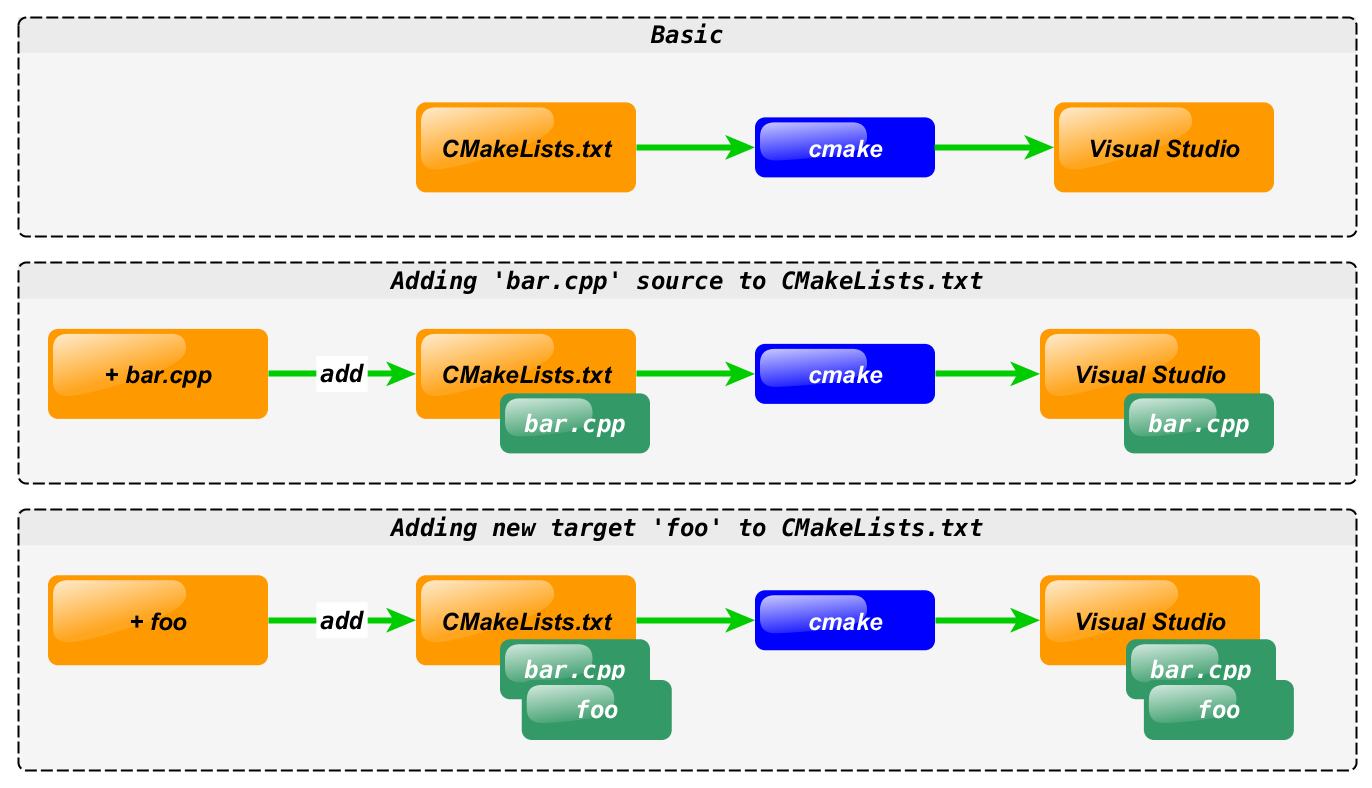 그래서 팀에 있는 모든 개발자는 CMake를 사용해서 프로젝트를 생성하는 방법을 알고 있어야 한다. 즉, 실제로는 각자가 어떤 CMake 인자를 써야하는지를 알고 있어야 한다는 뜻이다. Xcode는 `cmake -H. -B_builds -GXcode` Visual Studio는 `cmake -H. -B_builds "-GVisual Studio 12 2013"`같은 명령어들을 예로 들 수 있다.